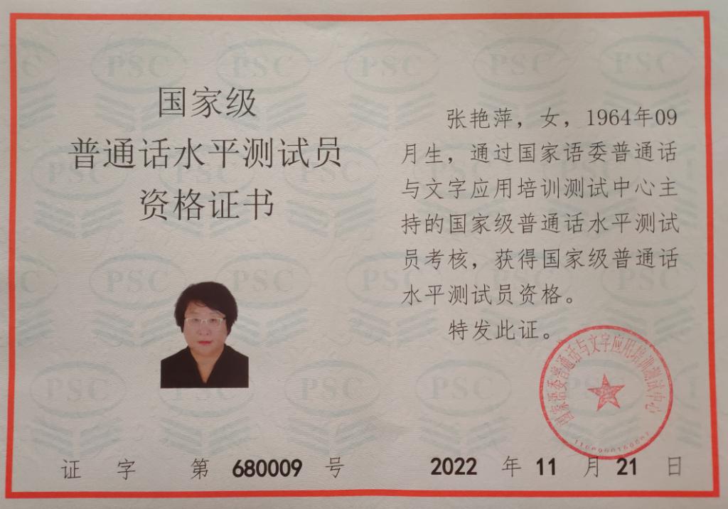 pg游戏电子模拟器张艳萍老师获得国家级普通话测试员资格证书 张艳萍老师是河北省普通话测试员,她不断进取,努力提高自己的普通话水平,积极参加普通话测试及推广活动。2022年经唐山市语委推荐,参加了国家语委组织的国家级普通话测试员培训。疫情期间,克服重重困难,完成了两期88学时的学习并通过严格考试,顺利通过了国家级普通话水平考试和国家级普通话测试员资格考试。因疫情原因,国家语委于今年暑假期间颁发证书。